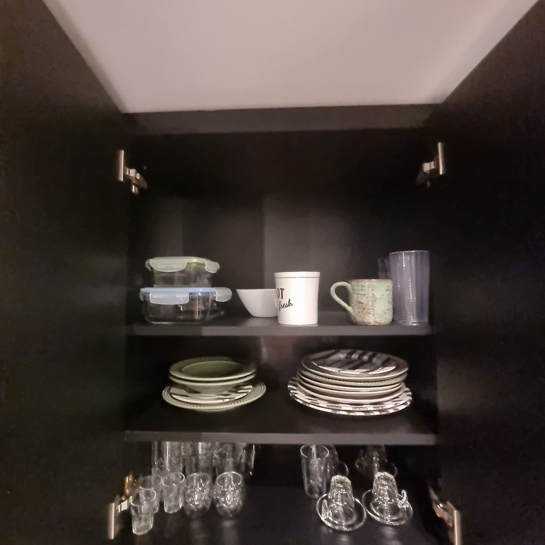 Distinctive bathroom, shower with stone covering, has a shower with glass enclosure. The open kitchen has built-in cabinets and a counter for meals and 2 stools, a cooktop with 2 burners, microwave and refrigerator with freezer. Dishes, cutlery, glasses, cups, pans and utensils complement the kitchen items for short or long-term stays.