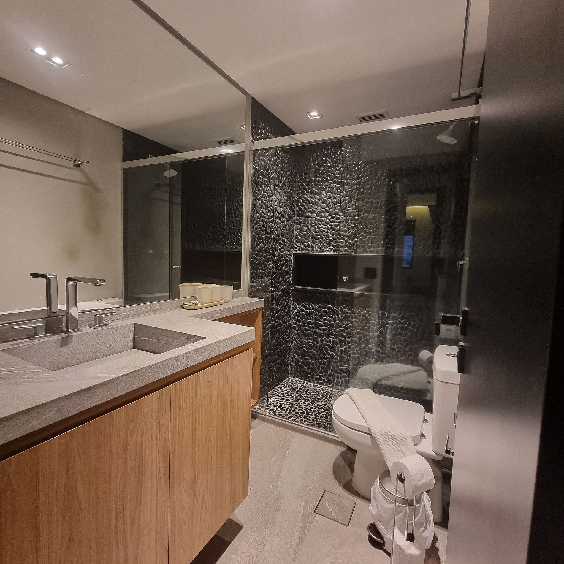 Banheiro diferenciado, Box com revestimento em pedras, possui ducha com box de vidro. A cozinha americana, conta com armários embutidos e bancada para refeições e 2 banquinhos,fogão cooktop de 2 bocas, microondas e geladeira com freezer. Louças, talheres, taças, copos, panelas e utensílios complementam os itens da cozinha para hospedagens de curta ou longa duração.