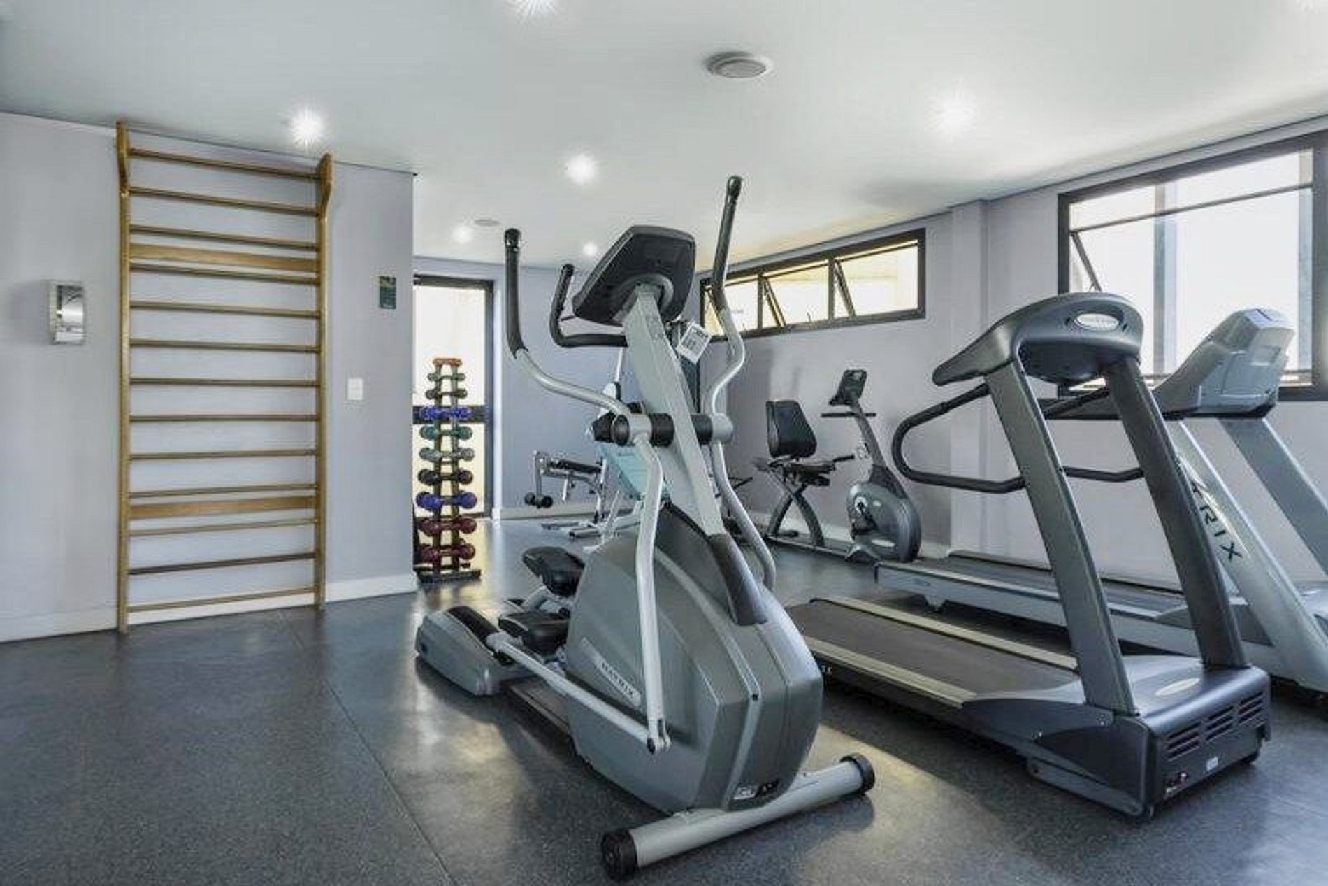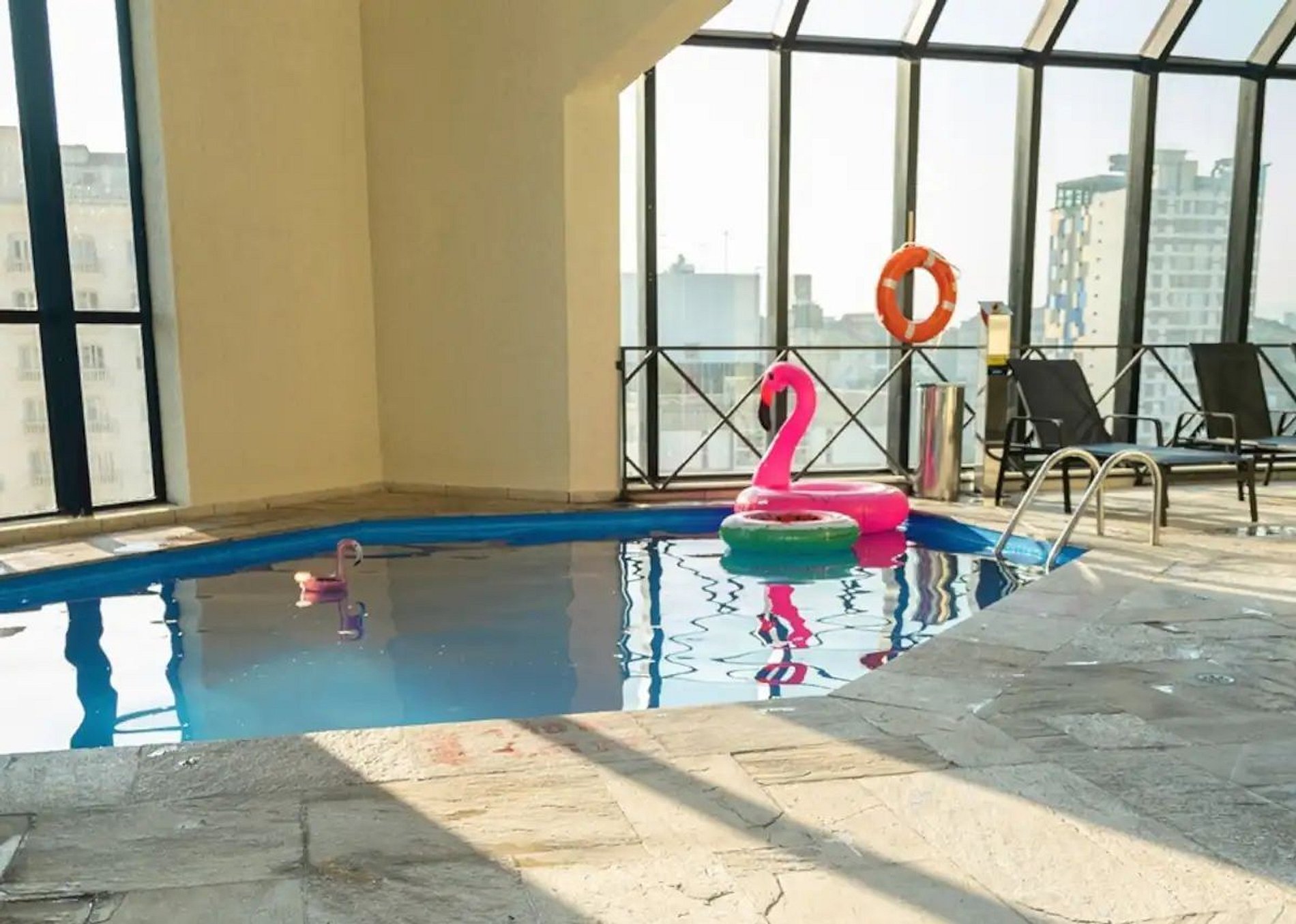 Os hóspedes podem usufruir da piscina, solário, academia e sauna localizados no último andar do prédio onde é possível apreciar uma linda vista da cidade.