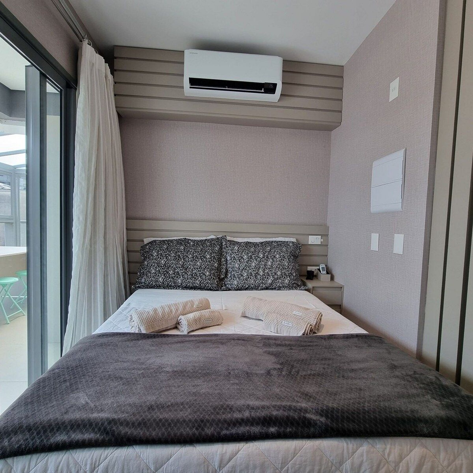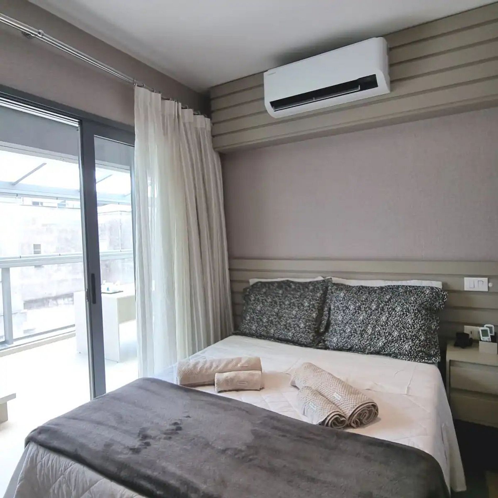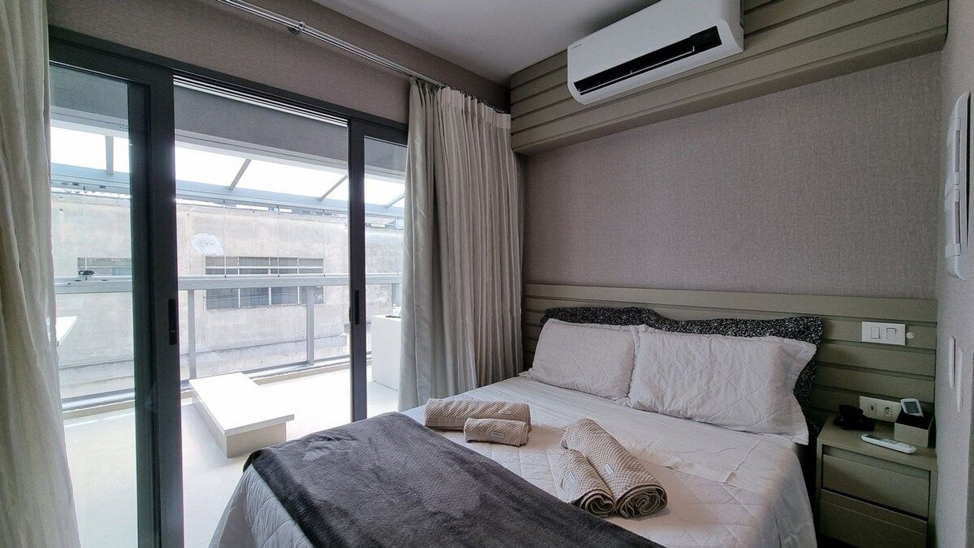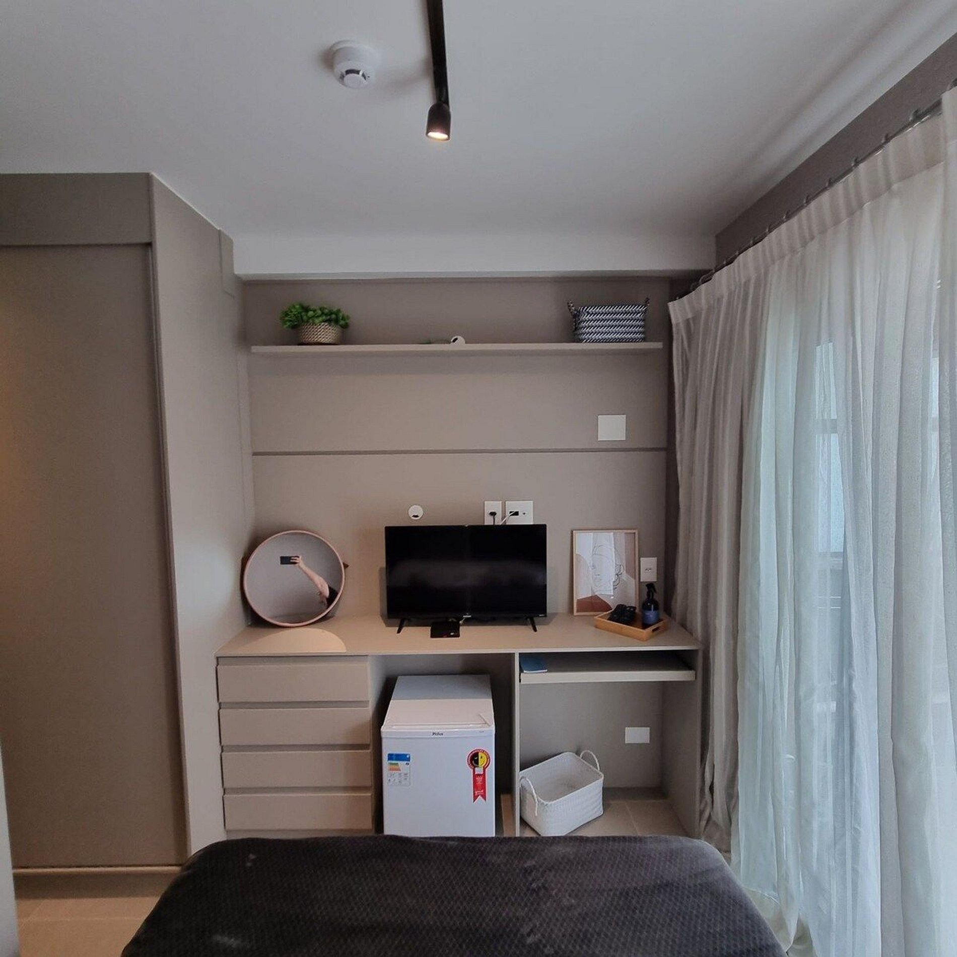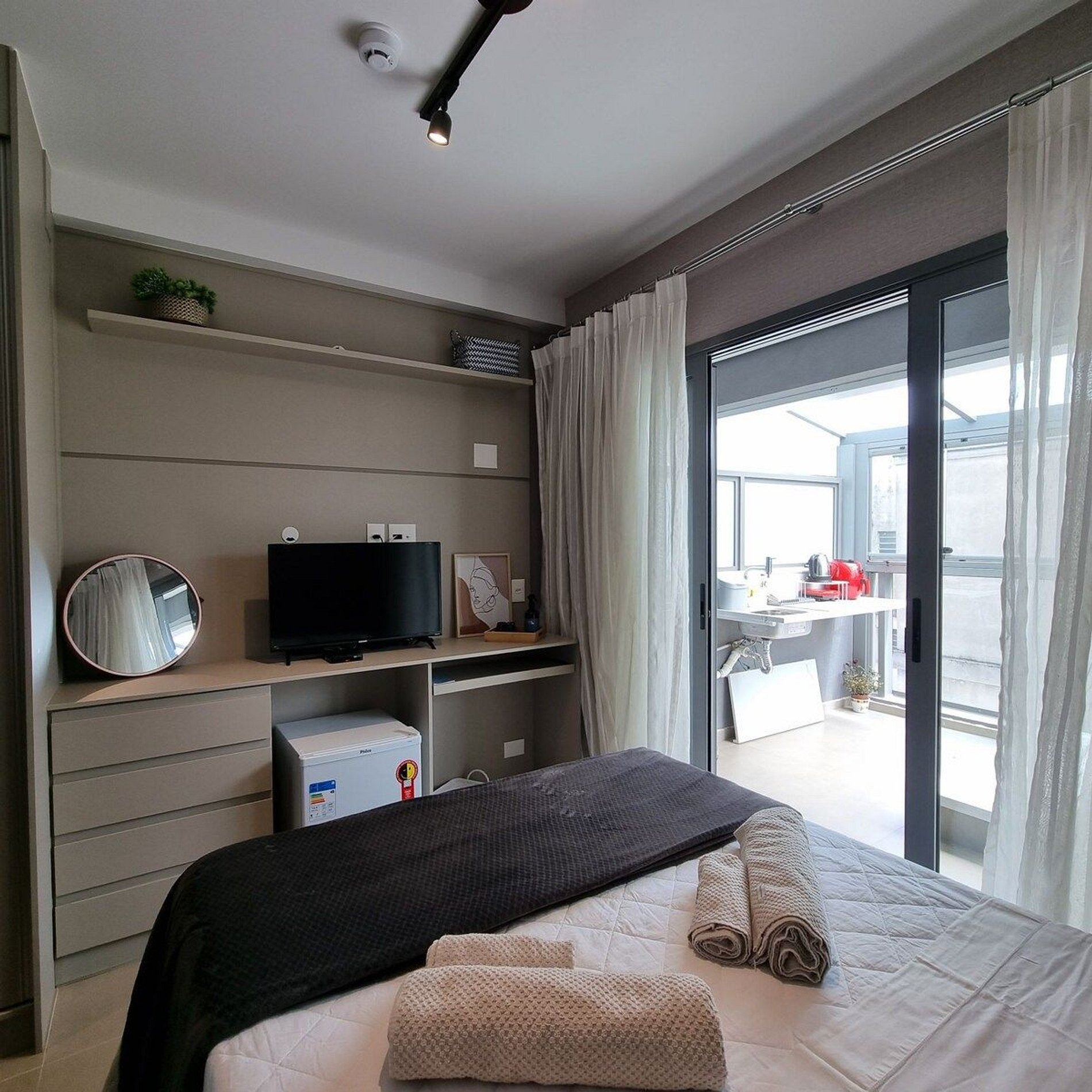 O apto particular, localizado no Vitacon Oscar Freire, com 01 dormitório, com cama de casal, tamanho padrão (1,38 x 1,88m), banheiro e uma área ampla envidraçada com mini-cozinha e mesa de jantar e/ou trabalho. Possui um aparelho de ar condicionado split no dormitório e outro na área envidraçada. TV 32" com acesso aos canais de TV à cabo, frigobar, ferro de passar roupas. Para o preparo de refeições práticas e rápidas, o apartamento oferece Airfryer, sanduicheira, chaleira elétrica, louças, talheres, copos e taças e demais utensílios. São fornecidas as roupas de cama e banho, travesseiros e cobertore. A troca do enxoval (roupas de cama e banho) são realizadas em hospedagens à partir de 7 diárias. Em caso de troca de enxoval antes de 7 dias é cobrado uma taxa extra e deve ser solicitado com até 24 horas de antecedência. Estacionamento Gratuíto com manobrista para um carro no próprio Flat. Os hóspedes podem usufruir da piscina, fitness, lavanderia, co-working e áreas de convivência dentro dos horários permitidos. TV a Cabo Claro - Plano Básico