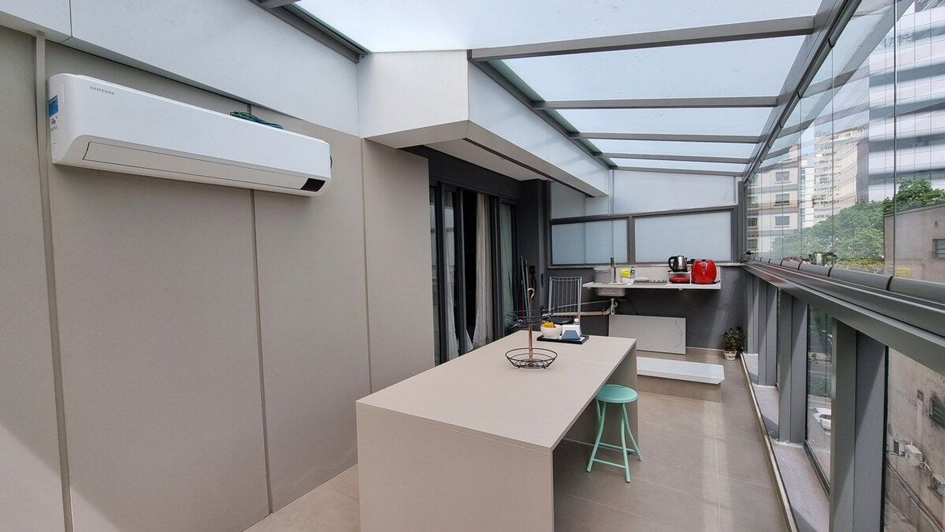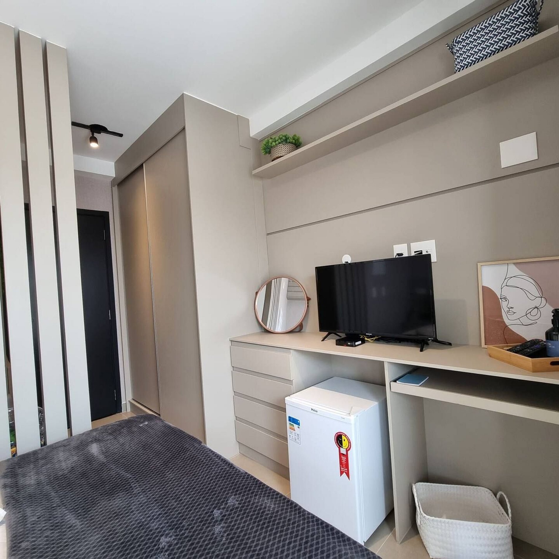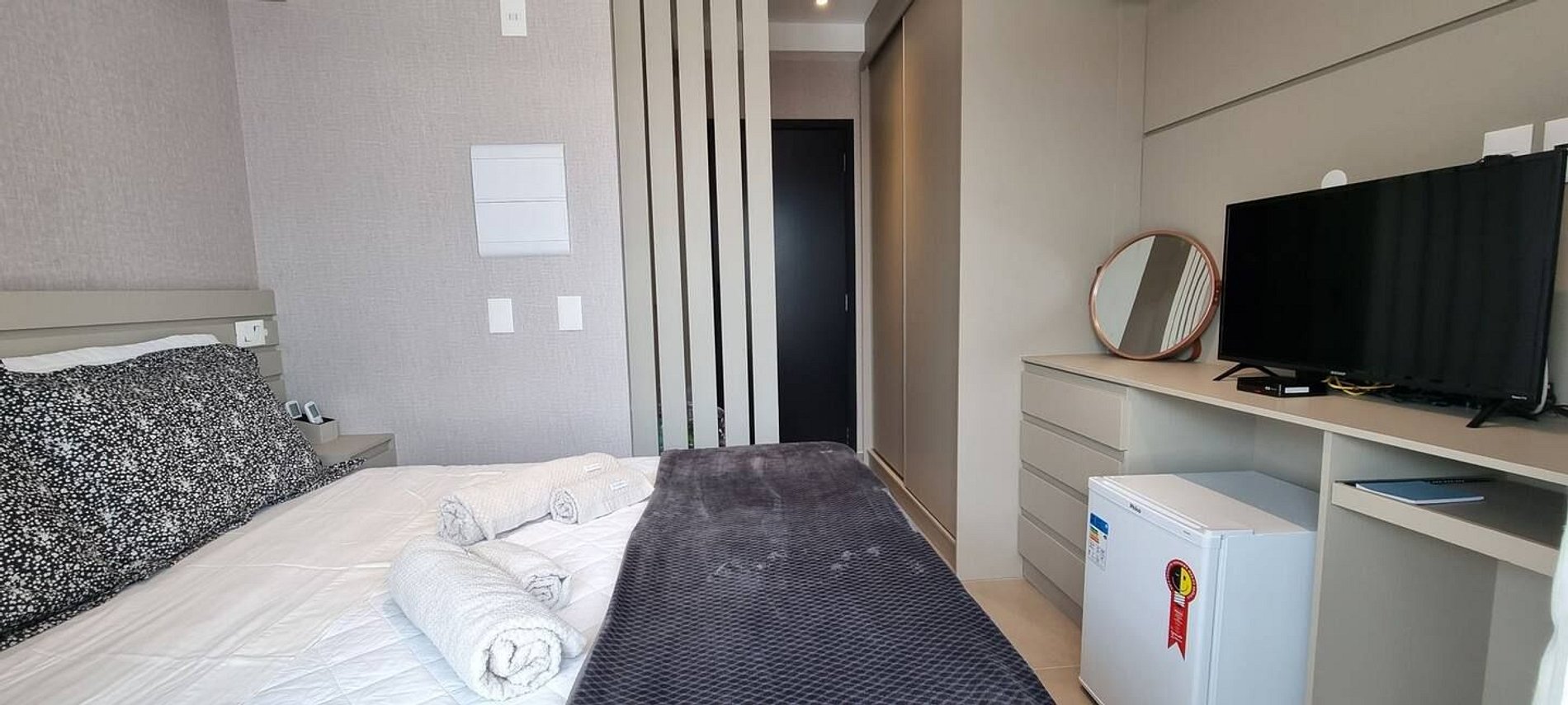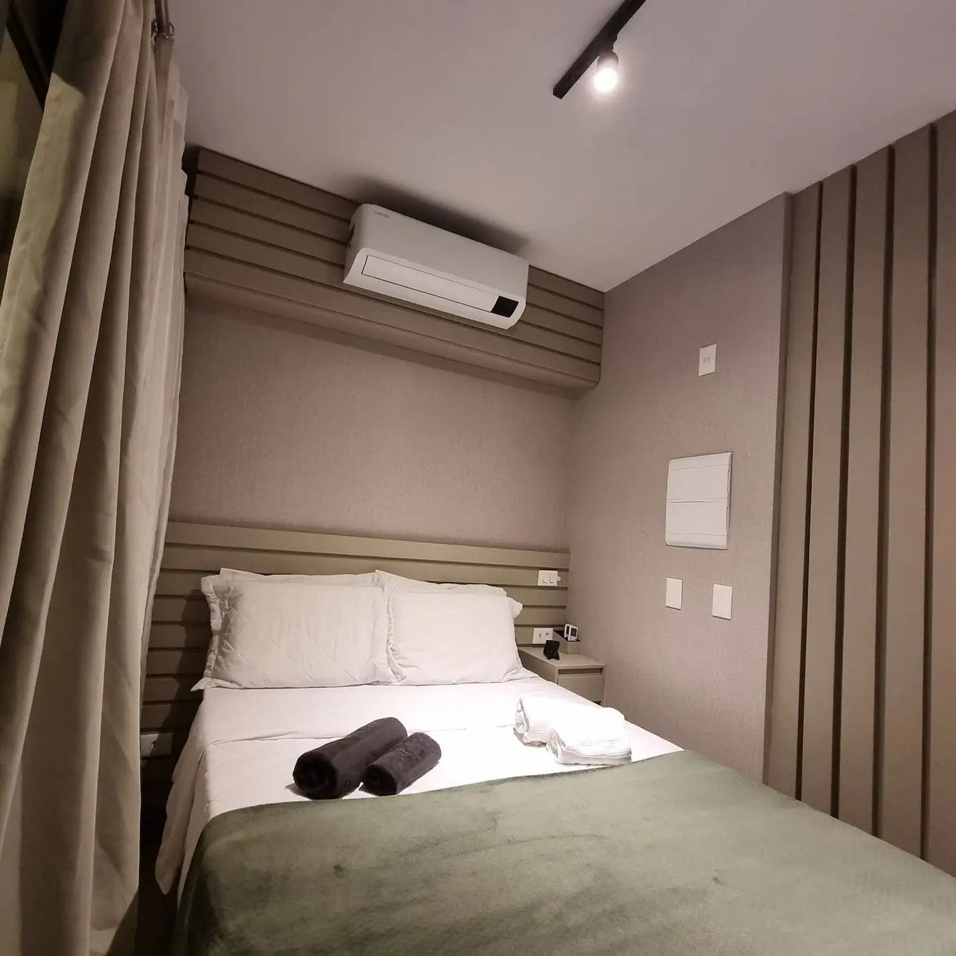 O apto particular, localizado no Vitacon Oscar Freire, com 01 dormitório, com cama de casal, tamanho padrão (1,38 x 1,88m), banheiro e uma área ampla envidraçada com mini-cozinha e mesa de jantar e/ou trabalho. Possui um aparelho de ar condicionado split no dormitório e outro na área envidraçada. TV 32" com acesso aos canais de TV à cabo, frigobar, ferro de passar roupas. Para o preparo de refeições práticas e rápidas, o apartamento oferece Airfryer, sanduicheira, chaleira elétrica, louças, talheres, copos e taças e demais utensílios. São fornecidas as roupas de cama e banho, travesseiros e cobertore. A troca do enxoval (roupas de cama e banho) são realizadas em hospedagens à partir de 7 diárias. Em caso de troca de enxoval antes de 7 dias é cobrado uma taxa extra e deve ser solicitado com até 24 horas de antecedência. Estacionamento Gratuíto com manobrista para um carro no próprio Flat. Os hóspedes podem usufruir da piscina, fitness, lavanderia, co-working e áreas de convivência dentro dos horários permitidos. TV a Cabo Claro - Plano Básico