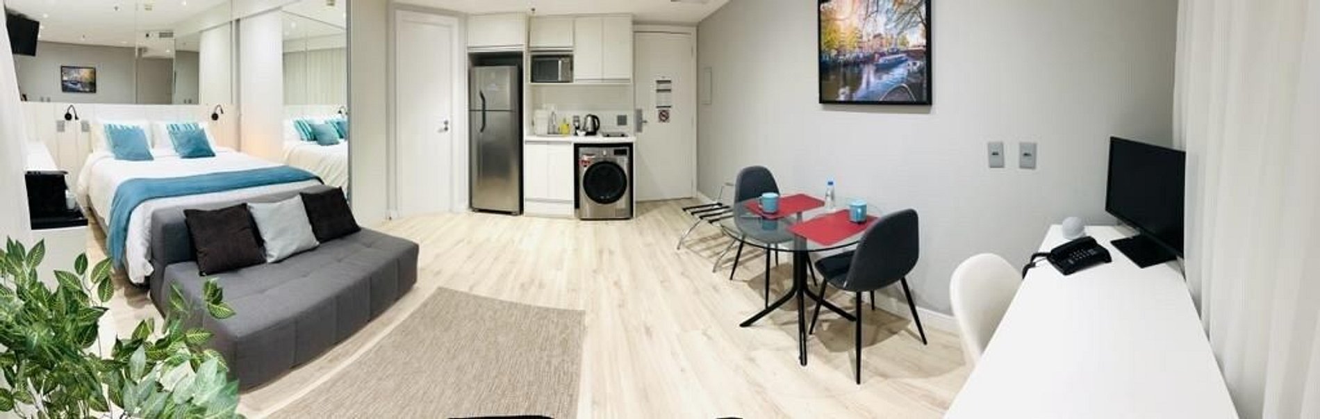 Apartamento particular localizado no Flat Radisson Vila Olímpia. Conta com cama Queen e um sofá. Ar condicionado, TV 32" com acesso à canais de TV à cabo, mesa de jantar/trabalho, geladeira com freezer, ferro e tábua de passar roupas. São fornecidas as roupas de cama e banho, travesseiros e cobertores.